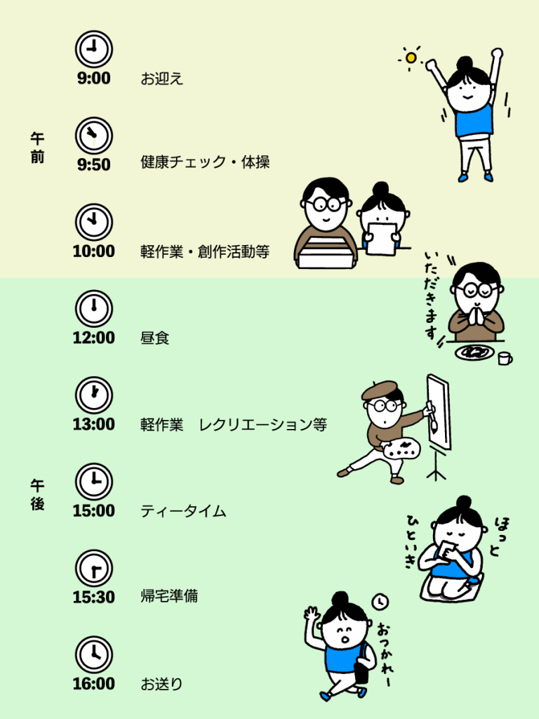 ご自宅にお迎えに伺い、帰宅時もご自宅に送迎させていただきます